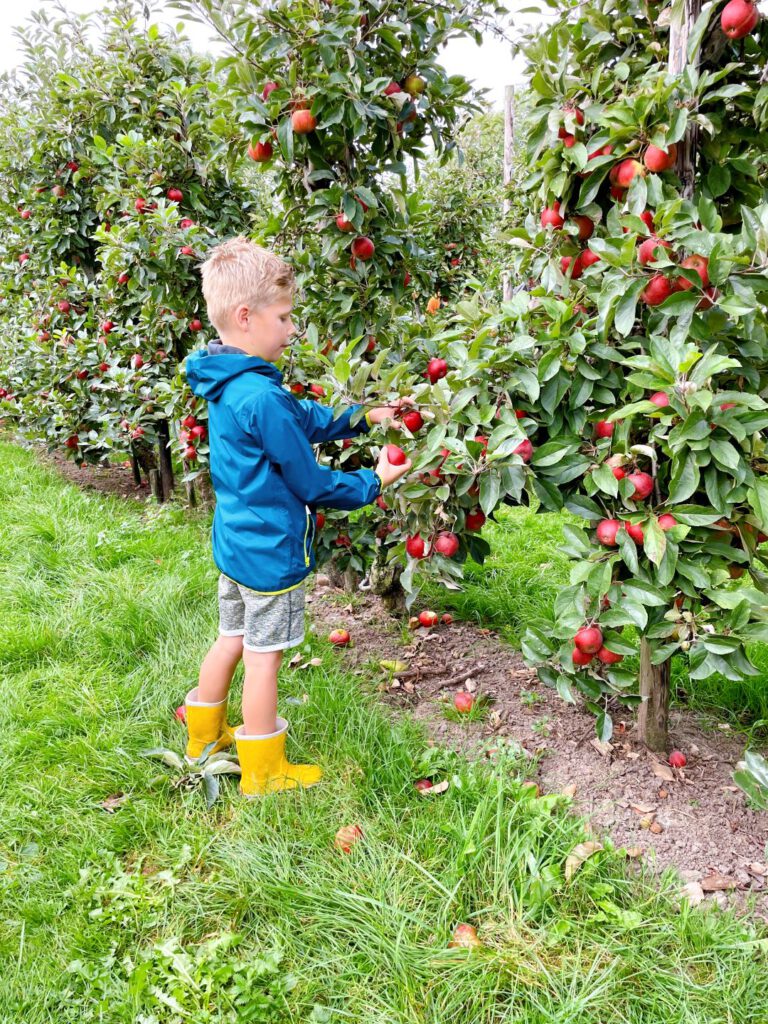 Onze auto parkeren we in het weiland tegenover de boerderij. Bij de ingang kun je muntjes kopen waarmee je met de huifkar richting de boomgaard kan of iets lekkers te eten en drinken kan halen. De jongens vinden het korte ritje in de huifkar geweldig, maar je kunt ook kiezen voor een boomgaard bij de boerderij. We besluiten om meteen de boomgaard in te gaan, want zo te zien verwachten ze een hoop mensen. De meest bekende appel is de Elstar, maar je vindt in de boomgaard van Boerderij Nieuw Slagmaat ook Gala, Jonagold, Goudreinette en nog veel meer. De boer legt je precies uit hoe je te werk moet gaan om de appels op de juiste manier met steeltje van de boom te plukken. Wat een toffe ervaring om door de boomgaard te struinen. De kosten voor het plukken zijn 1,50 euro per kilo. Maar dat is niet alles, behalve appels kun je ook peren, kiwibessen en pompoenen plukken.