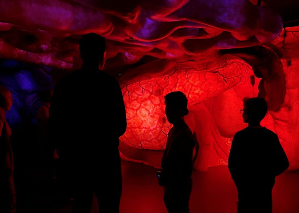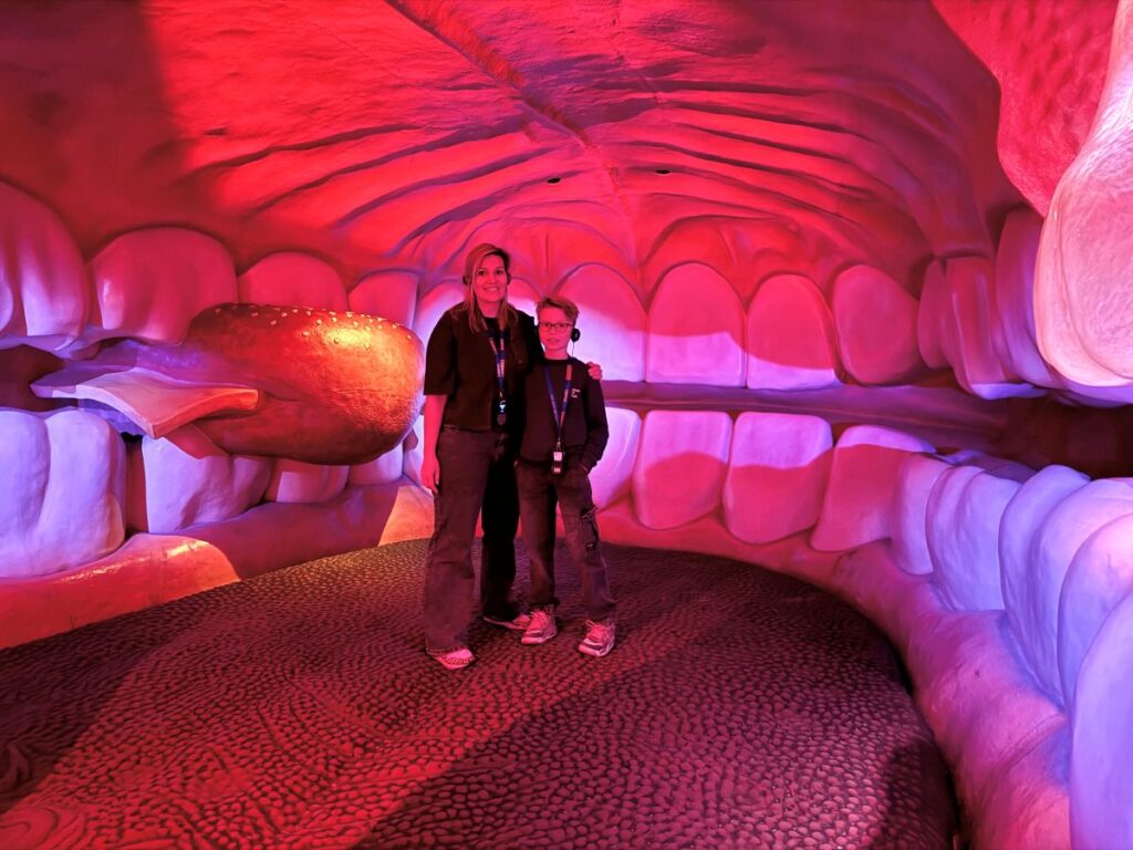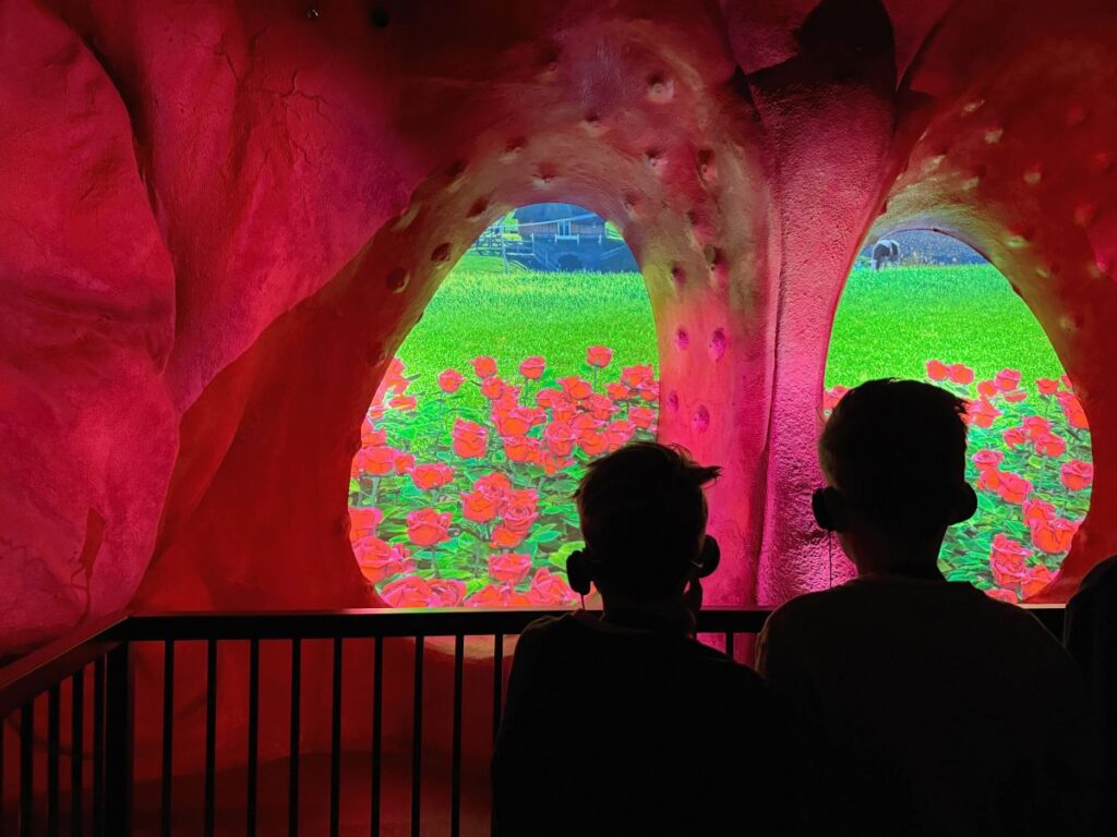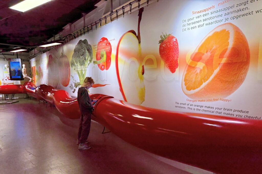 We maken een wandeling door de mond en springen op de tong, gaan even zitten in de hersenen en wandelen onder rommelende darmen door. Achter elke bocht duikt iets nieuws op. Overal is iets te zien — knipperende signalen, projecties op de vloer of het plafond. In de neus kijken we met 3D brillen en in de hersenen trillen en draaien de stoelen. “Wow mam, het leek wel alsof die splinter in mijn oog prikte.” Elke ruimte verrast opnieuw met andere effecten, beelden en ervaringen, waardoor geen enkel moment saai aanvoelt.
