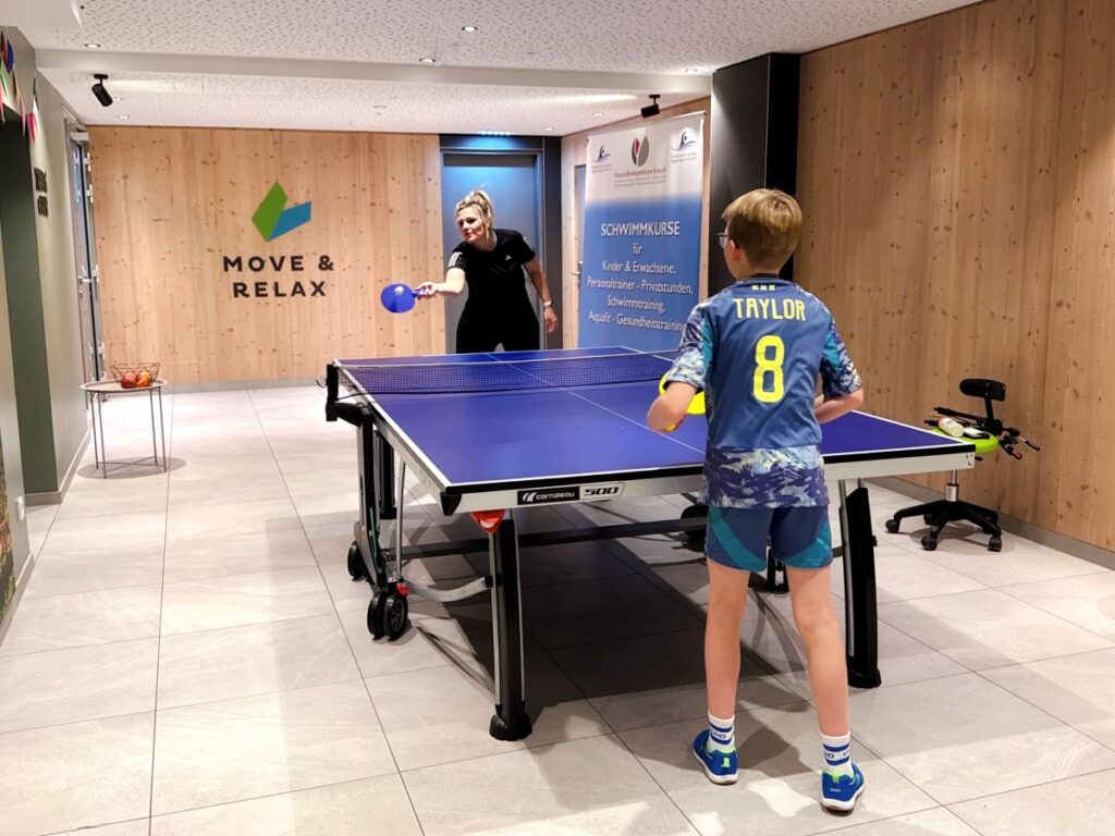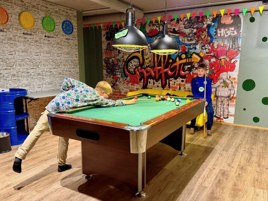 De jongens nemen meteen een kijkje op de begane grond van het hotel. Hier bevinden zich de kinderruimtes, sportruimtes en zwembaden. Ze zijn meteen in hun nopjes als ze de tienerkamer zien met biljarttafel en Playstations. Maar eerst gaan we zwemmen. Voor mijn jongens is dit niet een tussendoor activiteit, maar een vast onderdeel van een vakantiedag. Das Bayrischzell Move & Relax beschikt over een thematisch peuterbad met extra warm water, een binnen- en buitenzwembad voor families en een sportbad. In het familiezwembad kunnen kinderen naar hartenlust spelen, terwijl het sportbad zich uitstekend leent voor het zwemmen van baantjes. Daar maakte ik graag gebruik van op de vroege ochtend. Er is ook een familiesauna en een relaxruimte. Wil je even geen kids om je heen dan kun je heerlijk tot rust komen in de adults only zone.