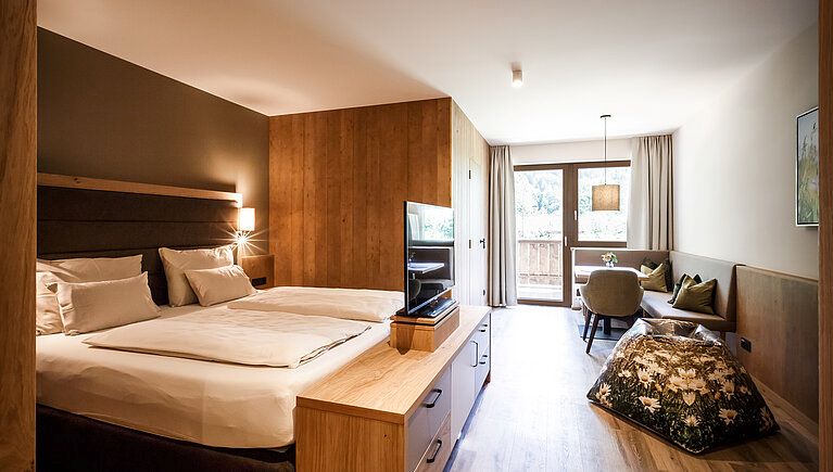 Onze familiesuite bevindt zich op de tweede etage en is modern, ruim en stijlvol. Heerlijk dat er een aparte slaapkamer is voor de kinderen. De fijne indeling zorg voor rust en privacy voor iedereen. De bedden nodigen uit voor een goede nachtrust en alles is tot in de puntjes verzorgd. De jongens zijn in hun nopjes met het grote bad in de luxe badkamer. Er liggen badjassen en slippers voor ons klaar. Vanaf het ruime balkon hebben we zicht op de tuin van het hotel en de besneeuwde bergen.