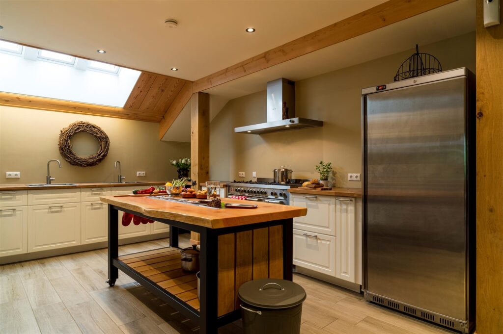 Als we de oprit oprijden van het landhuis valt meteen de gigantische tuin op. Het huis heeft een moderne uitstraling en via het overdekte terras stap je de leefruimte binnen. Het is een grote open ruimte met een gezellig zitgedeelte met een grote flatscreen-tv en ruime banken, een goed uitgeruste open keuken en een eettafel van maar liefst acht meter lang. Daarnaast is er nog een kleinere tafel waar je bijvoorbeeld gezelschapsspelletjes kunt spelen en er staat een tafelvoetbaltafel. De ruime open keuken is voorzien van alle benodigdheden om een uitgebreid diner te bereiden en te serveren voor 28 personen. Heel fijn zijn de grote koelkasten. Door een uitbouw aan de zijkant en een lichtstraat in de keuken is het een mooie lichte leefruimte.