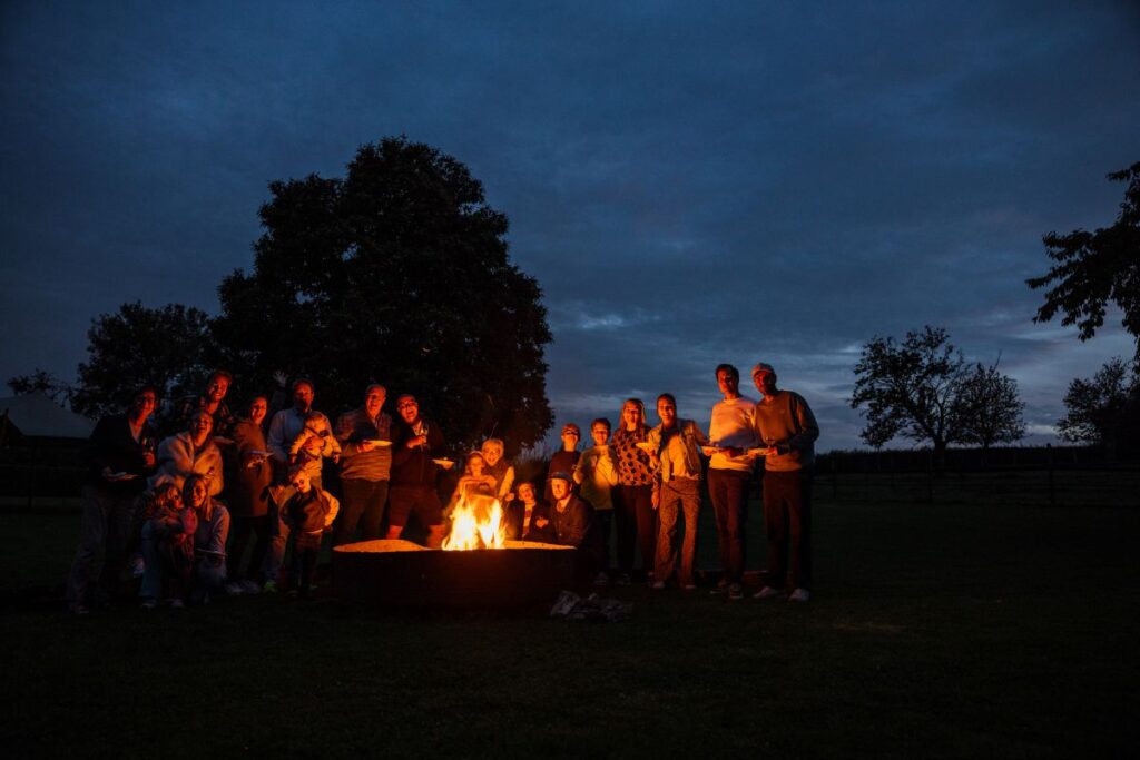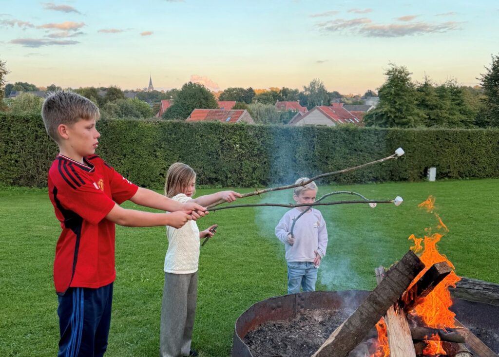 We boften enorm met goed weer dus we hebben veel tijd buiten doorgebracht. Uitgebreid borrelen in het herfstzonnetje op het terras terwijl de kinderen rond renden. Een nadeel waren de jonge katten die rond het huis liepen en maar al te graag van de borrelplank wilden snoepen. Nadat we met z’n allen aan de lange tafel hebben gedineerd, verzamelden we in het donker bij het vuur voor het roosteren van marshmellows. Op deze fijne plek hebben de kinderen geen moment gevraagd om beeldschermen en zijn we ver weg van de dagelijkse drukte.