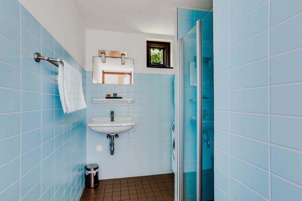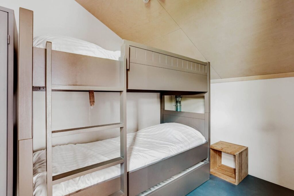 Naast de woonkamer is een grote slaapkamer, met fijne bedden zodat je echt goed kunt slapen na een dag buiten. Boven is het domein van de kinderen. Er is een aparte slaapkamer met stapelbed en een vide met een bank. Zo kan iedereen z’n eigen plekje vinden om zich even terug te trekken. De badkamer is modern en comfortabel en biedt plaats aan een wasmachine en droger.