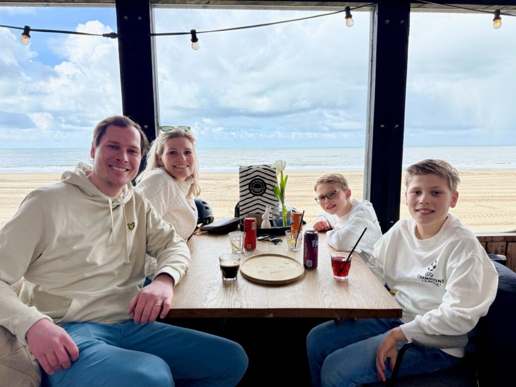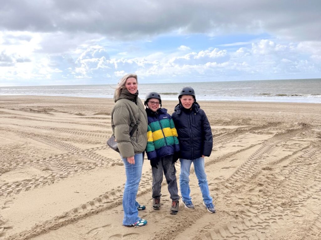 Het liefste was ik gaan mountainbiken, maar de jongens wilden dolgraag met e-choppers naar het strand. Dus helmen op en gaan! De jongens kunnen veilig achterop vanwege een rug- en voetsteun. Onze tocht begon met hagel en regenbuien, maar dat mocht de pret niet drukken. Net toen we bij het strand aankwamen liet de zon zich even zien. Bij strandtent De Jongens in Bergen aan Zee genoten we van een heerlijke lunch met zicht op zee. Op het strand is het rustig, er waaide een frisse wind door onze haren en de kinderen rennen enthousiast naar zee op zoek naar schelpen en aangespoelde schatten.