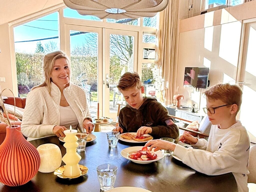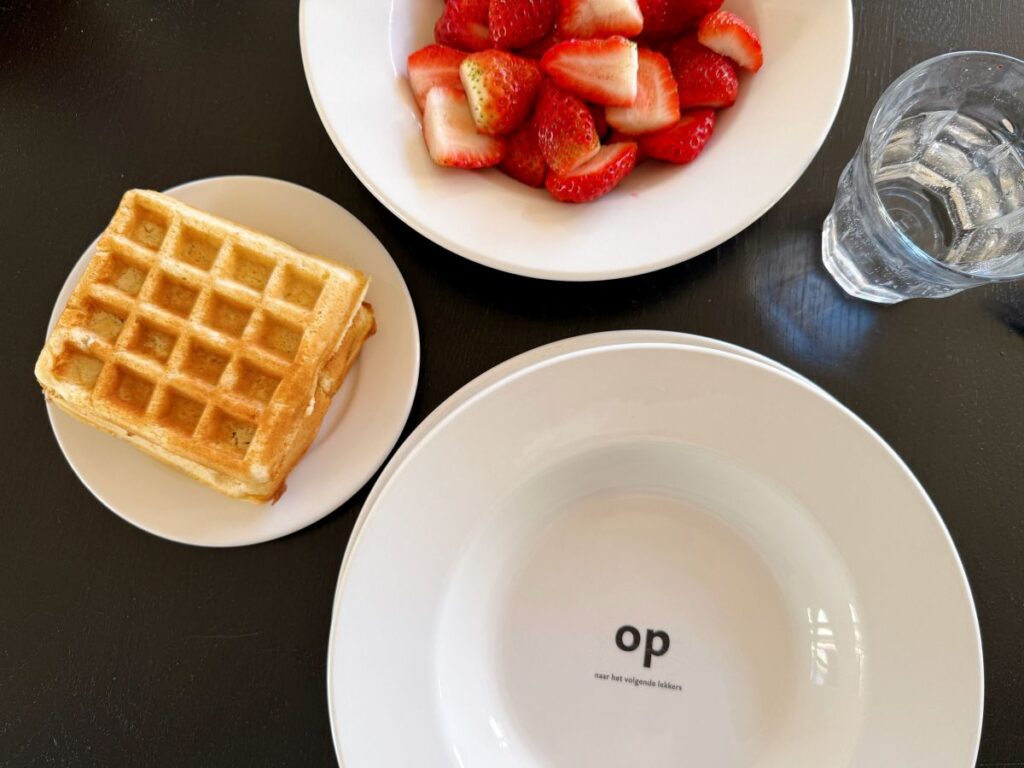 In de app van Dutchen kom ik een aantal tips tegen voor mooie wandelingen in de omgeving van Buiten Bergen. Eén daarvan is de ‘Wandeling Zandspoor’, een route van ongeveer vijf kilometer door de natuur. Als de mannen nog liggen uit te slapen, besluit ik van de gelegenheid gebruik te maken en er in mijn eentje op uit te trekken. In plaats van te wandelen trek ik mijn hardloopschoenen aan en volg ik de route hardlopend. De ochtend is schitterend: dauw ligt glinsterend op de velden terwijl de zon langzaam opkomt. Het is nog heerlijk stil en de frisse buitenlucht zorgt voor een ontspannen en mooie start van de dag. Daarna kruip ik nog even samen met de kids in bed om boekjes te lezen en ontbijten we met zelfgebakken wafels en aardbeien.
