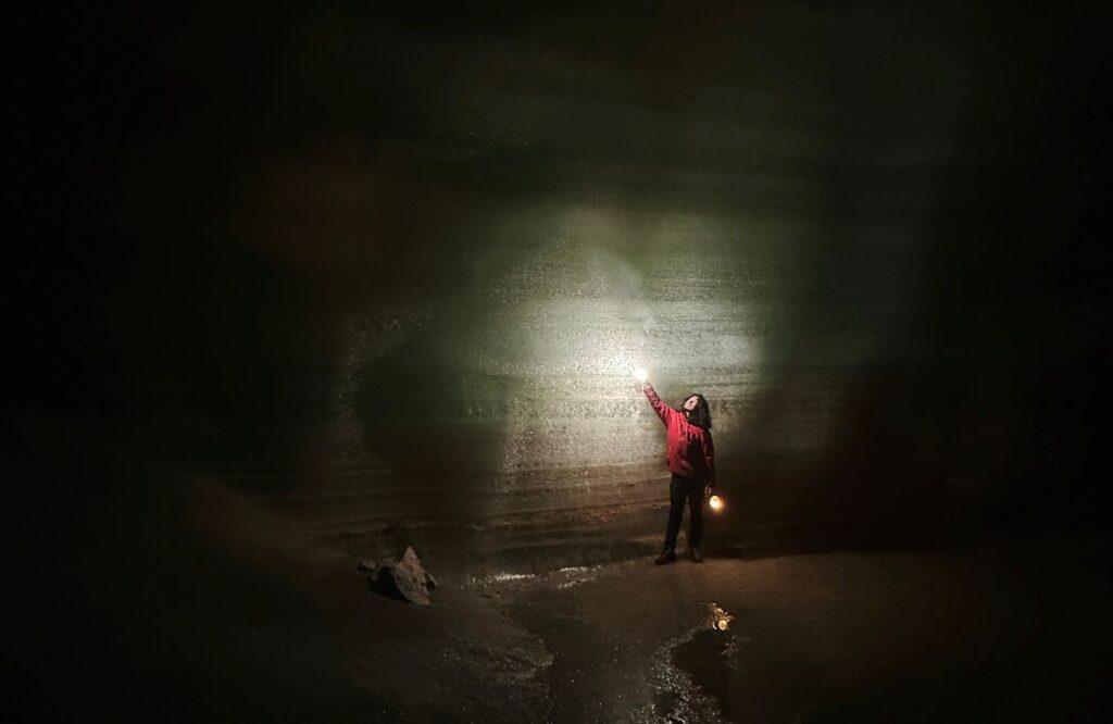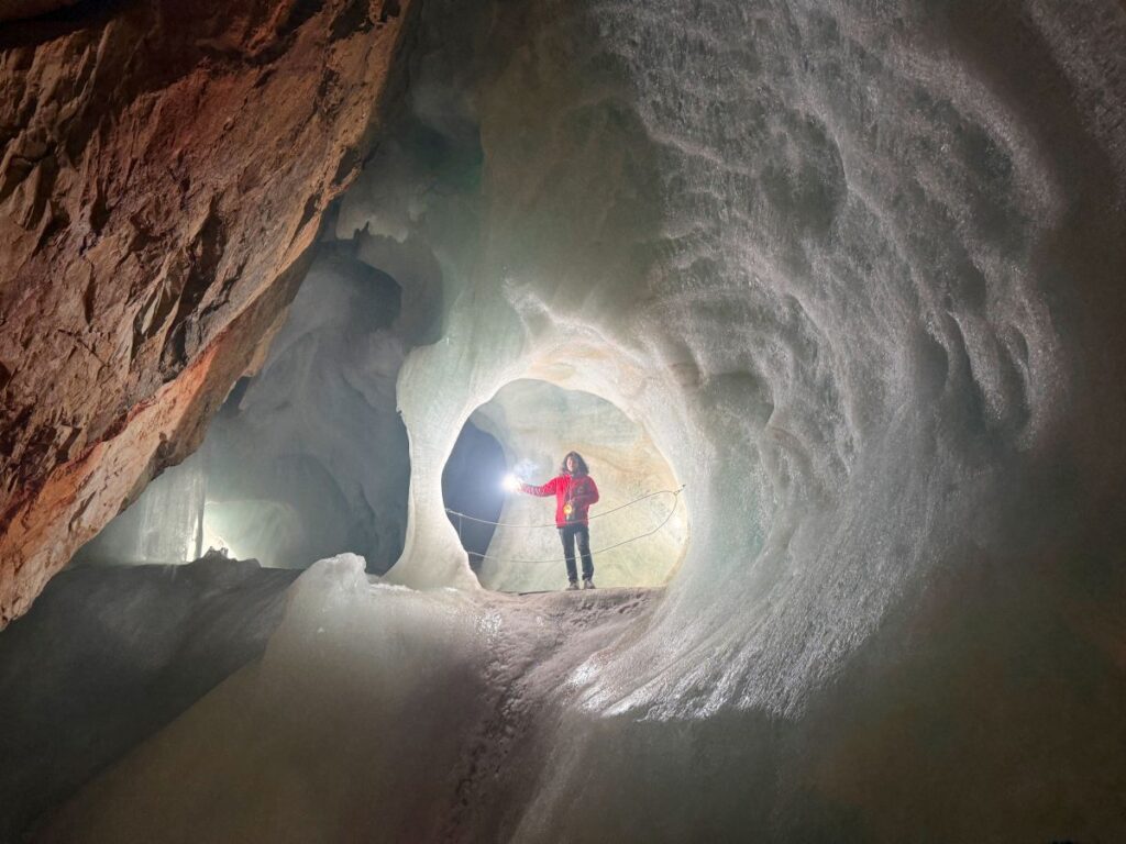 De gids leidt ons stap voor stap dieper de grot in. Het schijnsel van de lampen onthult reusachtige ijsformaties, bevroren watervallen en glinsterende sculpturen die lijken te bewegen in het flakkerende licht. We wandelen over houten trappen en smalle paden. Af en toe moet je bukken voor een uitstekende rots.