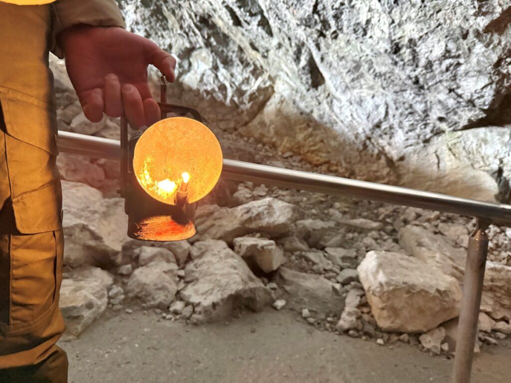 Omdat de grot een natuurmonument is, is er geen elektrische verlichting binnen. De gids deelt oude mijnlampen uit met een echt vuurvlammetje. De jongens vonden het reuze spannend, want het bracht meteen een mysterieuze sfeer. Eenmaal binnen gingen we 700 traptreden omhoog. Het is een flinke klim en je eigen verantwoordelijkheid om te bepalen of je deze inspanning aankan. Het tempo van de rondleiding wordt aangepast aan elke groep. Zo werd er tijdens de klim meerdere pauzemomenten ingelast. Maar voor bezoekers met mobiliteitsbeperkingen of hart- en vaatziekten wordt de rondleiding afgeraden.
