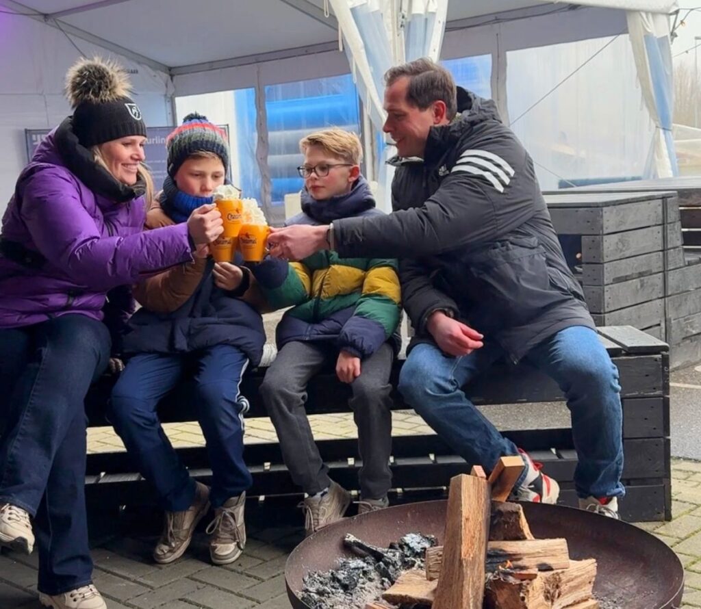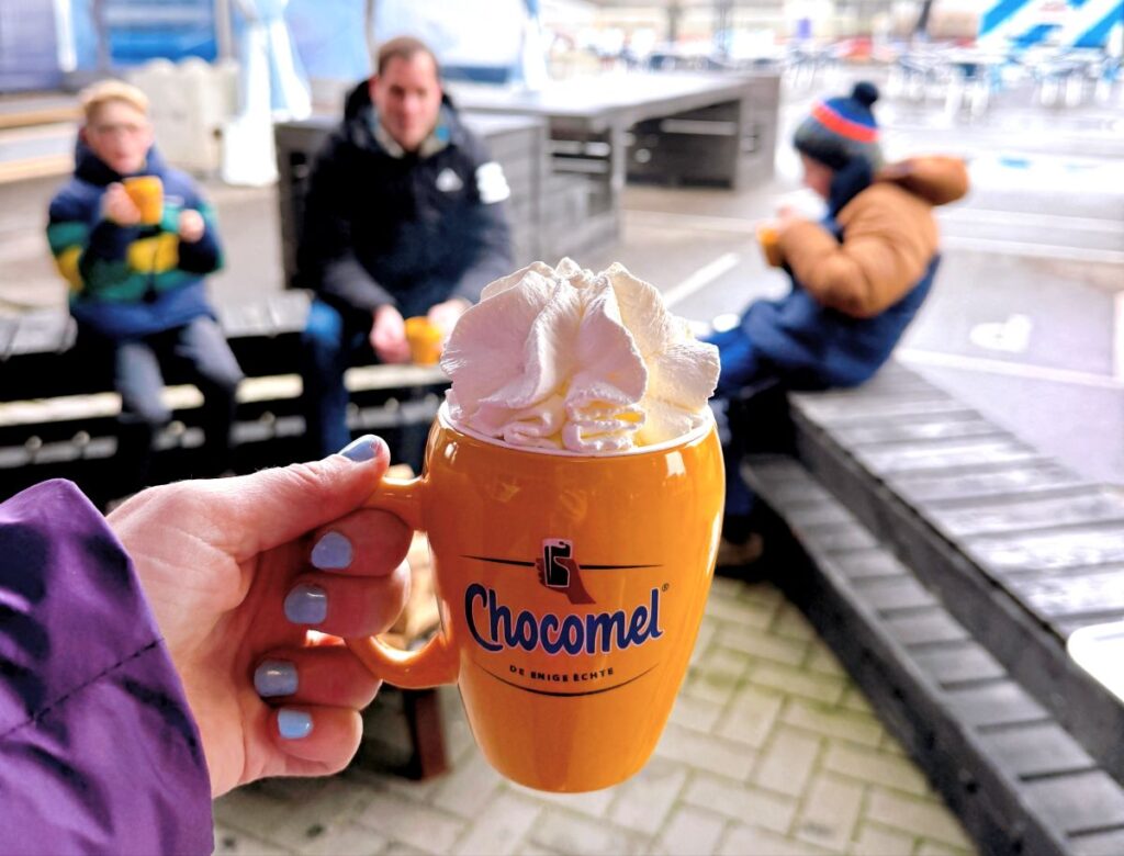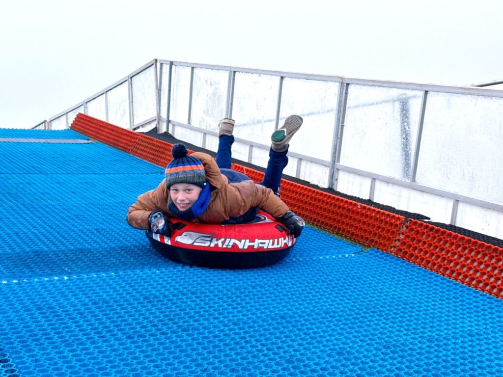 Naarmate we verder liepen, begonnen de jongens te klagen over koude tenen. We besloten op te warmen in het restaurant en even later nipten we met roze wangen en tintelende vingers van een warme chocolademelk met slagroom bij een vuurkorf. Zodra we allemaal weer een beetje waren ontdooit, waren we klaar om nog meer te ontdekken. Het IJsbeelden Festival blijft namelijk niet bij de ijssculpturen alleen. Voor kinderen zijn er binnen en buiten speelplekken om tijdens het bezoek lekker te spelen. Zo gingen we voor het eerst curlen en bleek mijn zoon een verborgen talent te hebben. En de jongens zijn wel 100x van de tubing baan naar beneden gegleden. En natuurlijk ging ik met ze mee. Maar je kunt ook een street art-tentoonstelling bewonderen, souvenirtjes kopen in de shop of genieten van versgebakken poffertjes bij de poffertjeskraam.