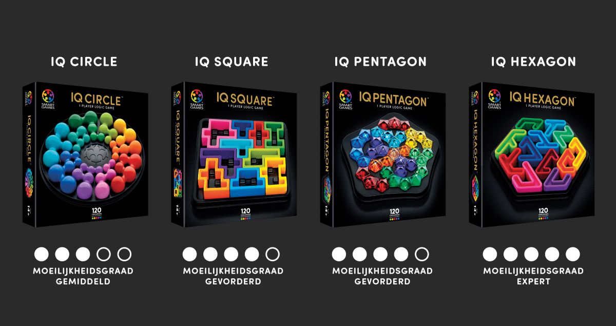 De IQ Deluxe Editions bestaan uit vier unieke puzzelspellen: IQ Circle, IQ Square, IQ Hexagon en IQ Pentagon. Elk spel bevat 120 opdrachten die stapsgewijs in moeilijkheid toenemen en gericht zijn op het trainen van cognitieve vaardigheden zoals probleemoplossend denken, concentratie en logica. De reeks vormt een samenhangend geheel, met elk spel een eigen karakter en oplopende complexiteit, geschikt voor zowel beginners als gevorderde puzzelaars.