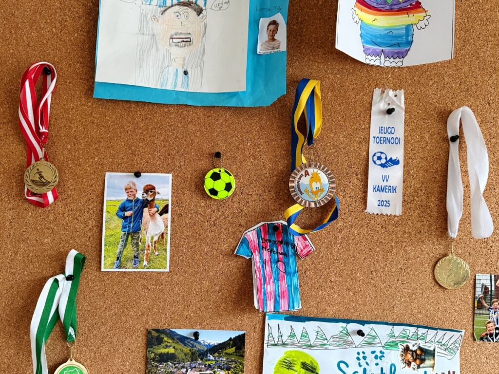 Eén element dat hier perfect bij aansluit is een muur van kurk. Praktisch, stoer en verrassend stijlvol. Een muur moet niet bepalen hoe een kamer eruitziet, maar juist ruimte geven om te veranderen. En dat is waar de kurkwand in beeld kwam. Het is geen vaststaand decor maar brengt leven in de kamer. Het ene moment hangt hij vol foto’s en posters, morgen maakt hij plaats voor een schoolplanning of nieuwe interesse. Zonder te hoeven boren kun je de kamer telkens opnieuw inrichten. Dat vind ik een groot voordeel van kurk: hoe snel je de kamer een totaal andere uitstraling kunt geven.
