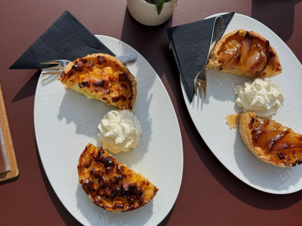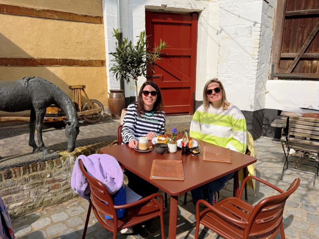 Ons bezoek aan Limburg begon op het zonnige binnenhof van restaurant Burgemeester Quicx gelegen op het landgoed van Château St. Gerlach. Het gebouw was vroeger de woning van de burgemeester van Houthem (1836-1863) en dat historische karakter zie je nog steeds terug in de houten balken, dikke mergelmuren en de landelijke inrichting. Op het binnenhof zitten we tussen historische gebouwen en groen, terwijl het rustig geroezemoes en het gerinkel van kopjes zorgen voor een ontspannen vakantiesfeer. We genoten van huisgemaakte appel- en perentaartjes met sinaasappel en lemoncurd. De combinatie van de zoete taart, het frisse citrusaccent en de rustige omgeving maakte dit een bijzonder ontspannen begin van onze Limburgse ontdekkingstocht.