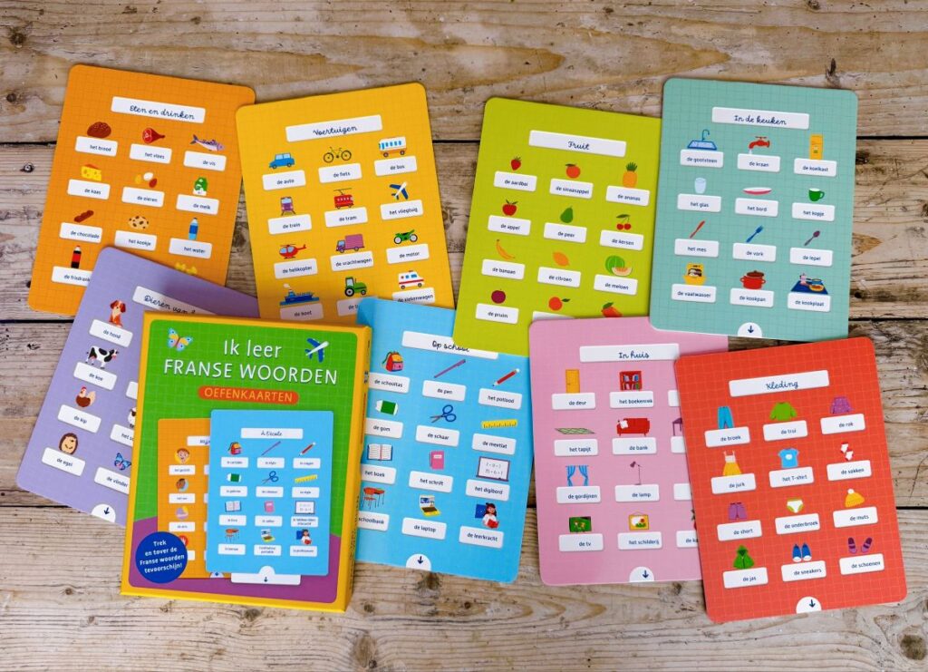 Spelenderwijs een woordje Frans leren? Met de interactieve kaarten Ik leer Franse woorden leer je op een speelse en ontspannen manier. Je kiest een thema, trekt onder aan de kaart en het Franse woord komt tevoorschijn. De kaartenset bevat acht kleurrijke kaarten van stevig karton waarop 16 thema’s uit het dagelijkse leven zijn uitgewerkt. In totaal kun je meer dan 200 woorden leren aan de hand van duidelijke illustraties.
